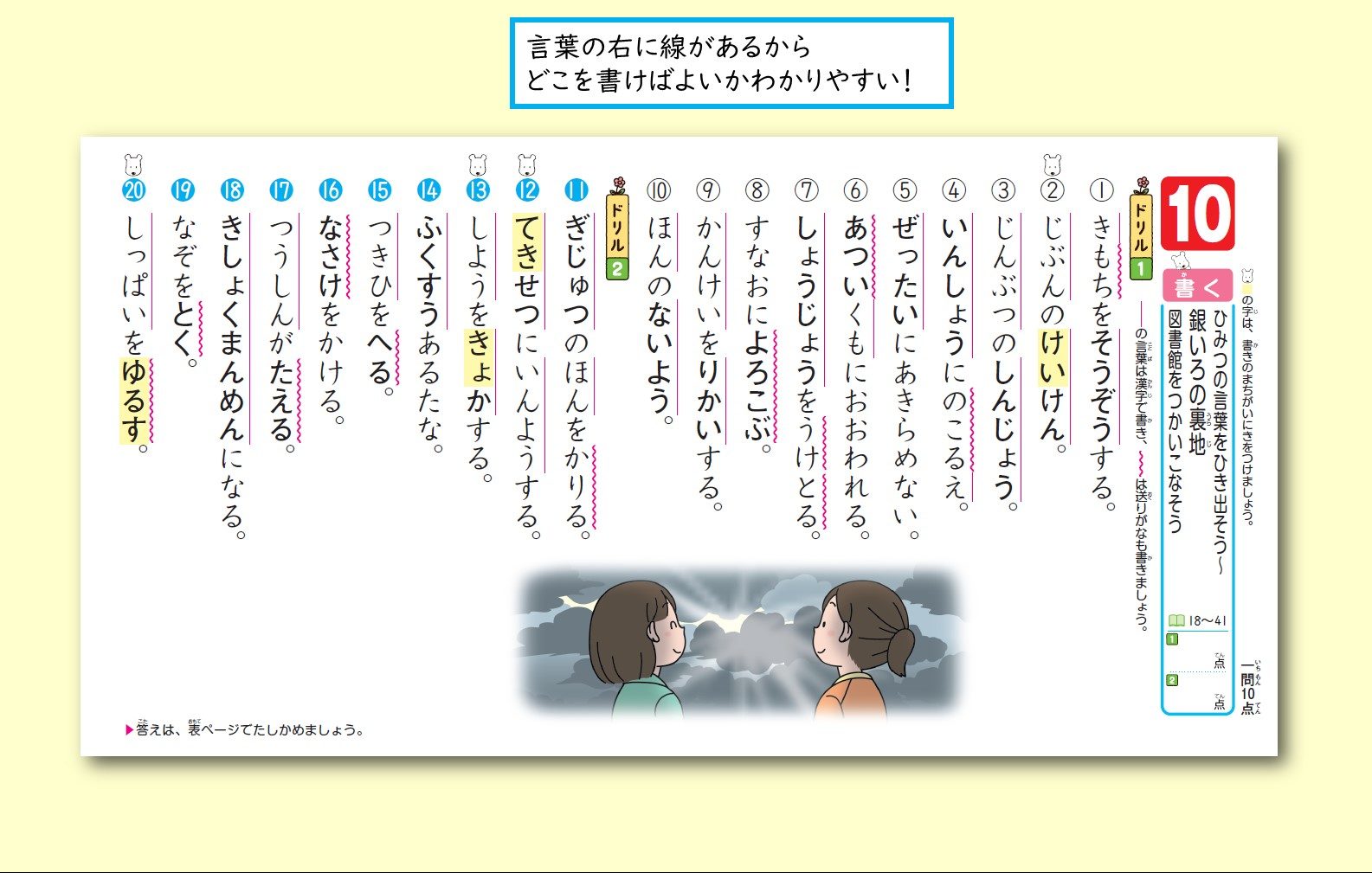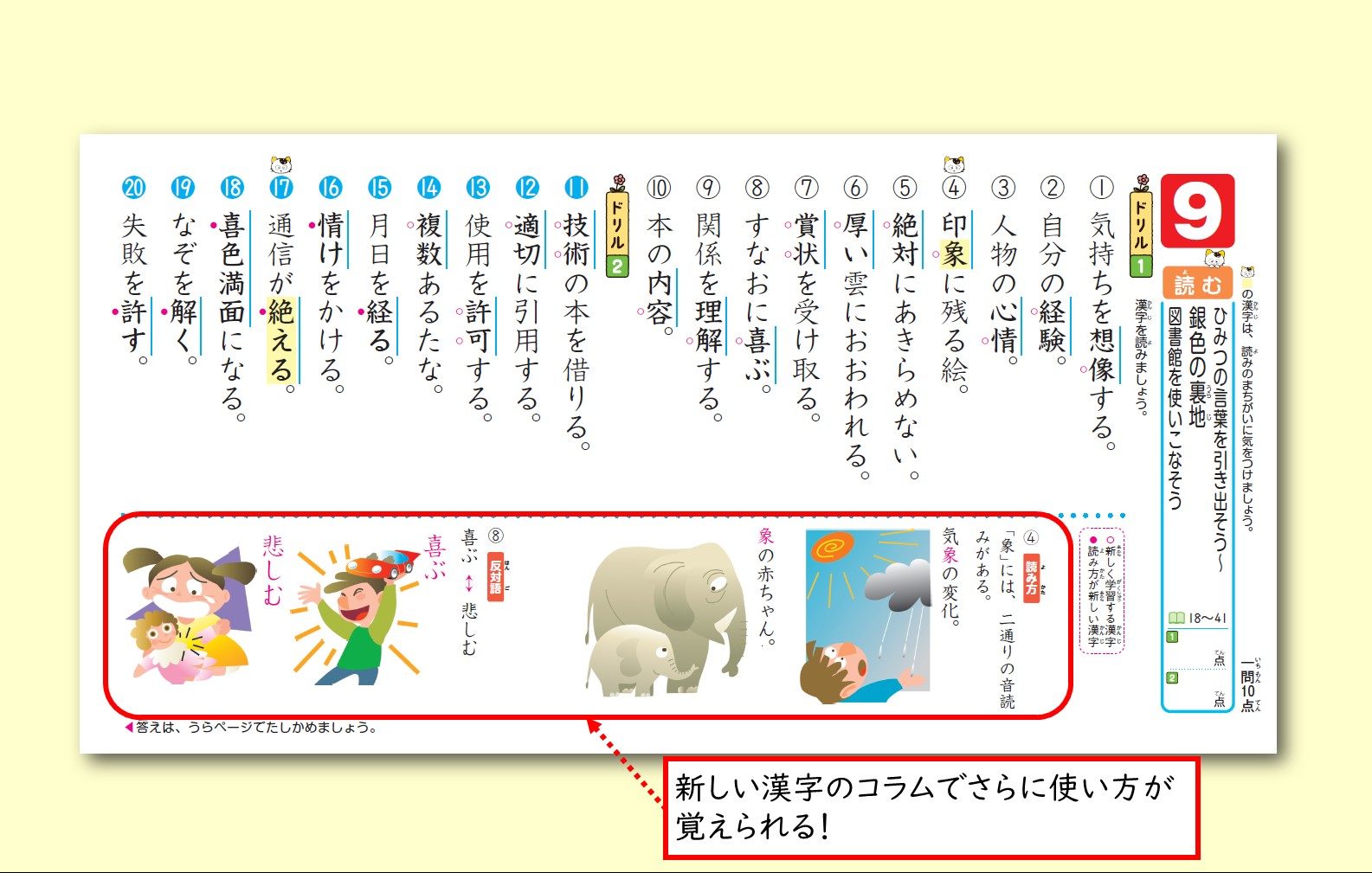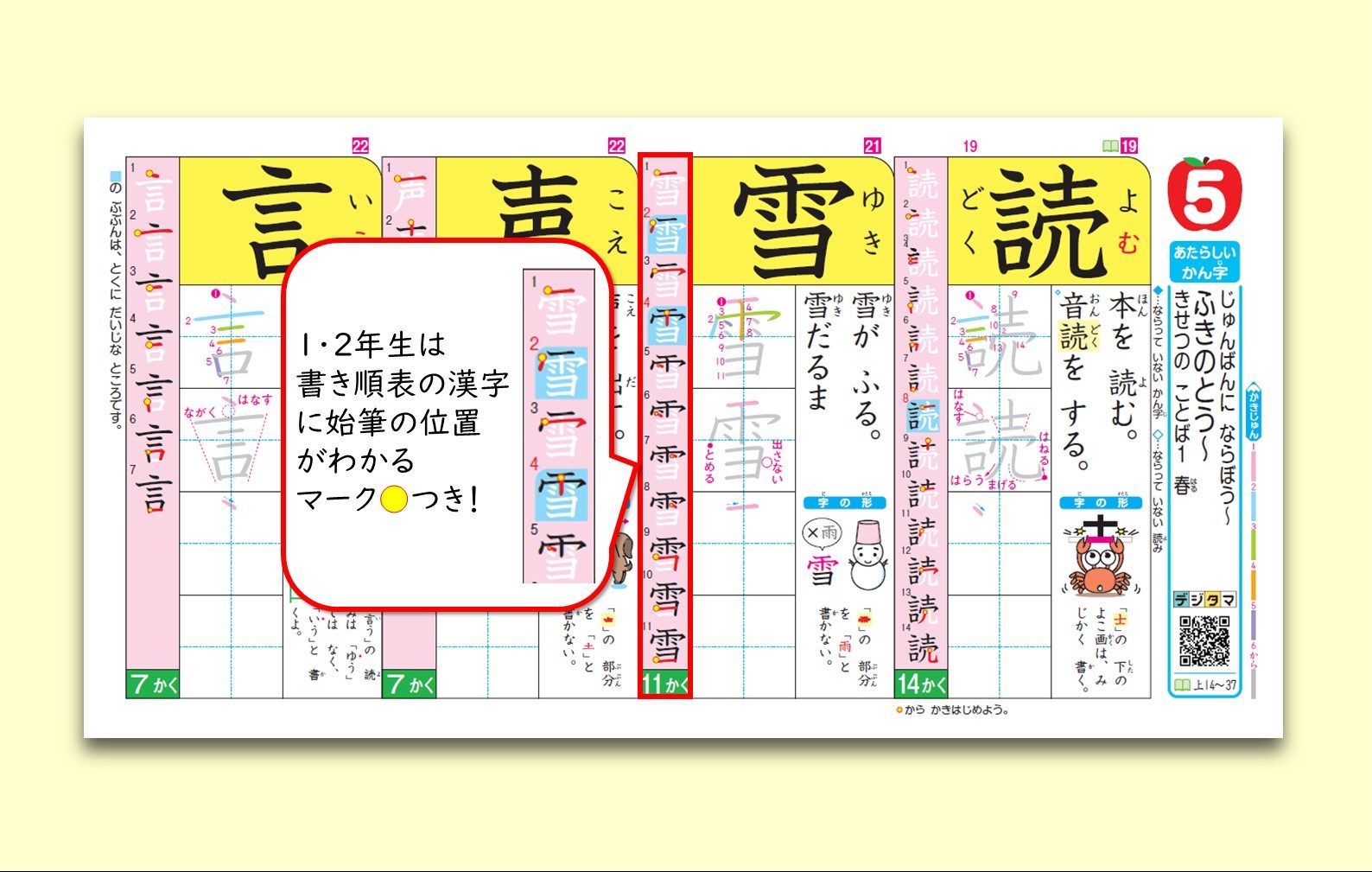 「読む」「書く」ページでは、文章の中でも新しい漢字を練習できます。間違えやすい漢字がすぐにわかるよう、タマやポチのマークが入っています。