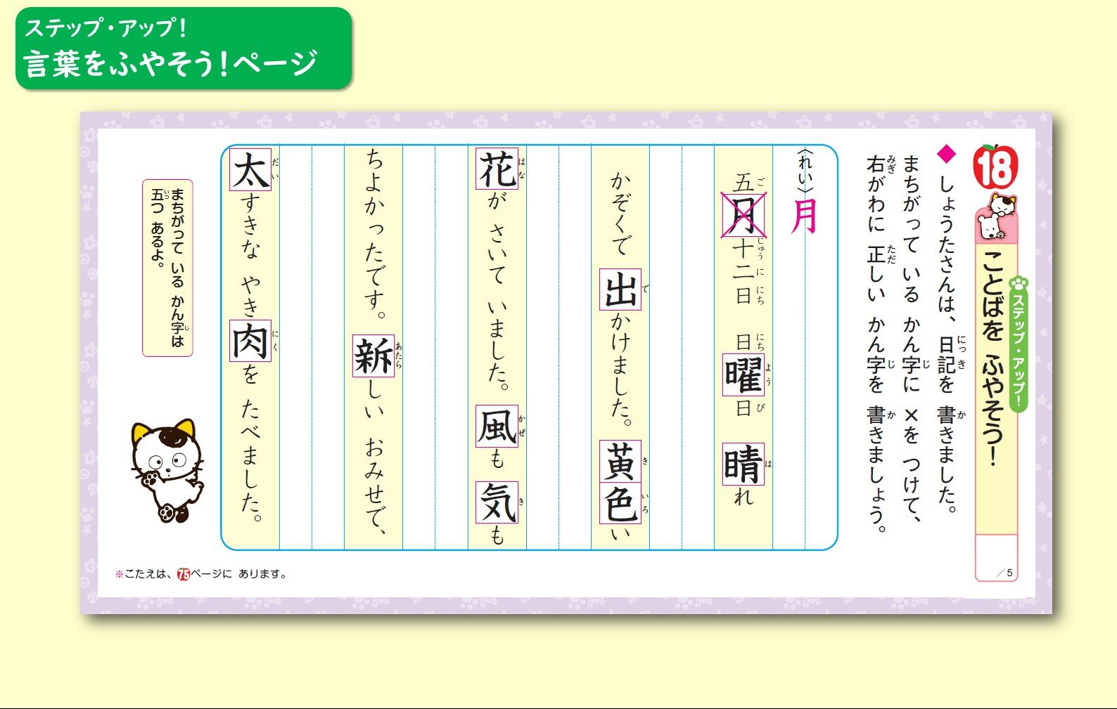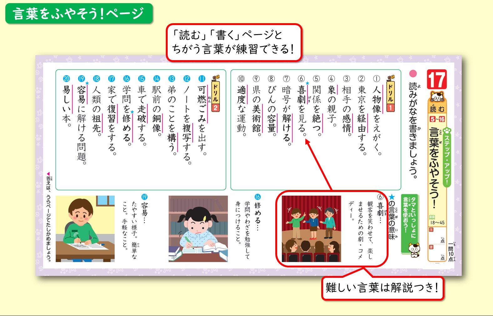 「ステップ・アップ! 言葉をふやそう!」ページでは、「読む」「書く」ページとは違う言葉を練習することができます。