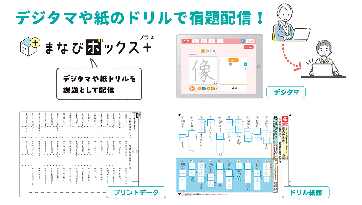 まなびボックス+とは、デジタル教材のスタディ・ログだけでなく紙教材のログも一元管理できる、新学社独自の「学習管理システム(LMS)」です。