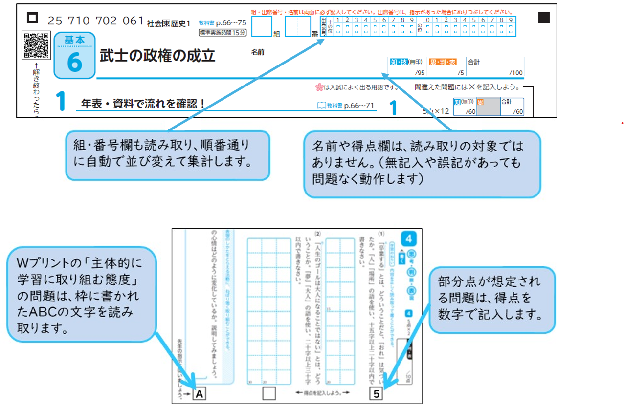 - 生徒が自己採点する場合は、事前に生徒用書き方マニュアルを配布し、自己採点後にチェックボックスに「×」印や数字等の記入を行うようご指示ください。ただし、「Wプリント(評価プリント)」の「主体的に学習に取り組む態度」の問題については、記述内容をご確認の上、先生方が評価し、評価結果(ABC)を記入してください。