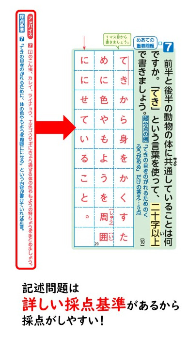 テスト教師用では解答をどこから抜き出したらよいかが一目で分かる引き出し線や、誤答例や部分点の例など、採点の際に活用いただける工夫がいっぱいです。記述問題についての採点基準は特に詳しくなっており、多くの先生からご好評いただいております。
