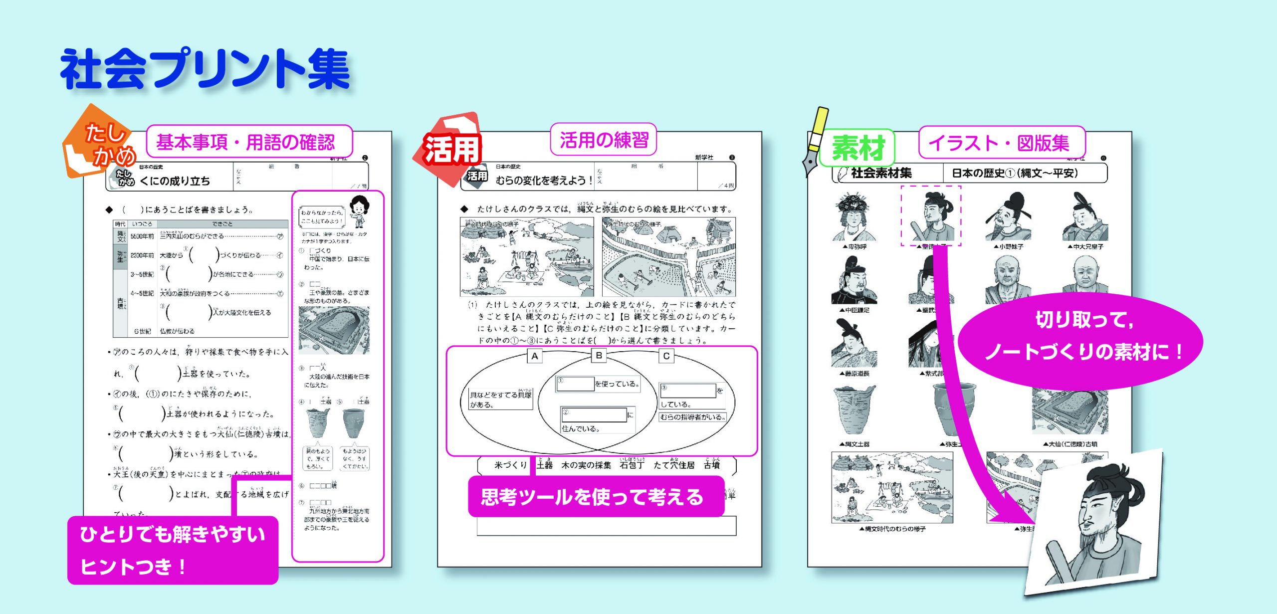 社会プリント集の活用回ページは,授業の話し合いの題材としても使えると思いました。プリントの形式になると,「思考」させるような教材がなかなかないので,こういうものがあるとうれしいです。