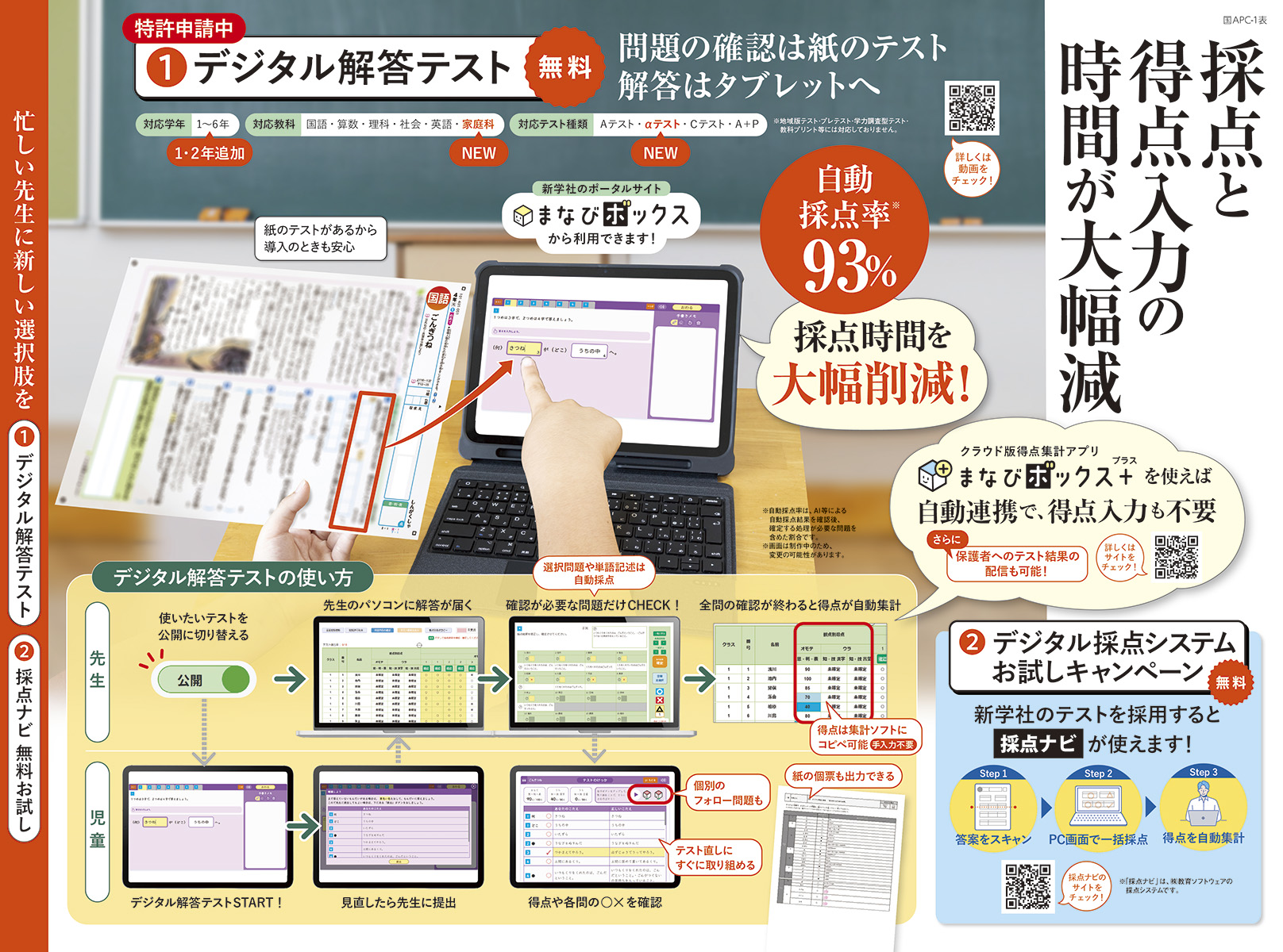 新学社のテストをご採用いただくと、(株)教育ソフトウェアの採点システム「採点ナビ」がテスト情報入力済みの状態ですぐにお使いいただけます。お問合せは コチラ から。