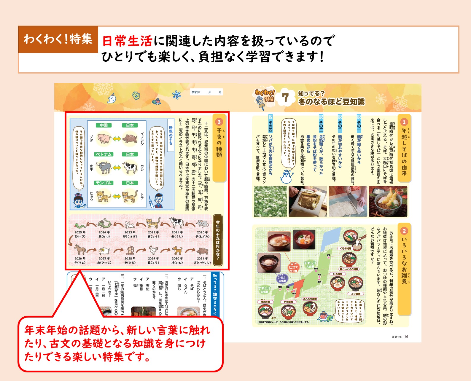 ・日常生活に絡めた「わくわく!特集」で、ひとりでも楽しく、負担なく学習できます。