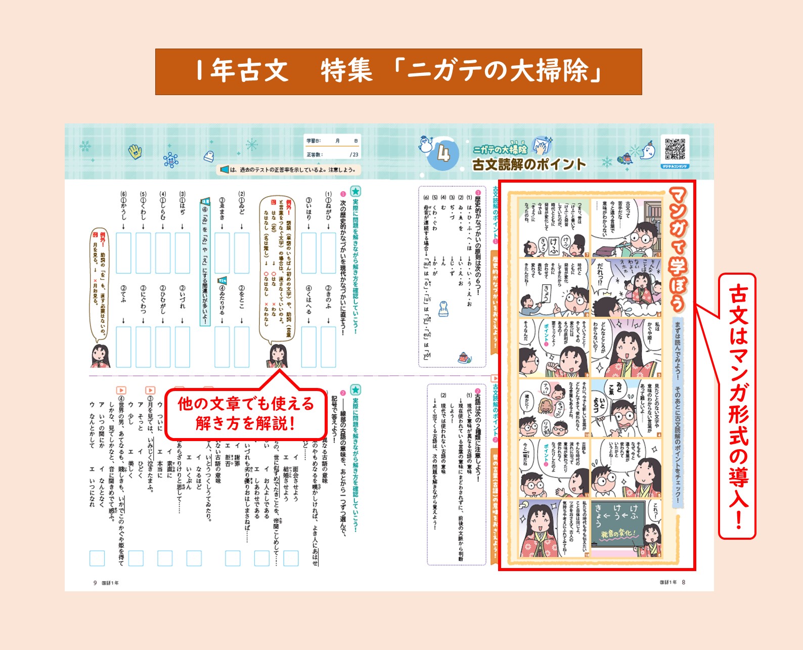 【特集回】「特集 ニガテの大掃除」では、他の文章でも使える読解問題の解き方&古文の基本事項を解説しています。古文はマンガ形式の導入で、ニガテな生徒でも楽しく取り組めます!