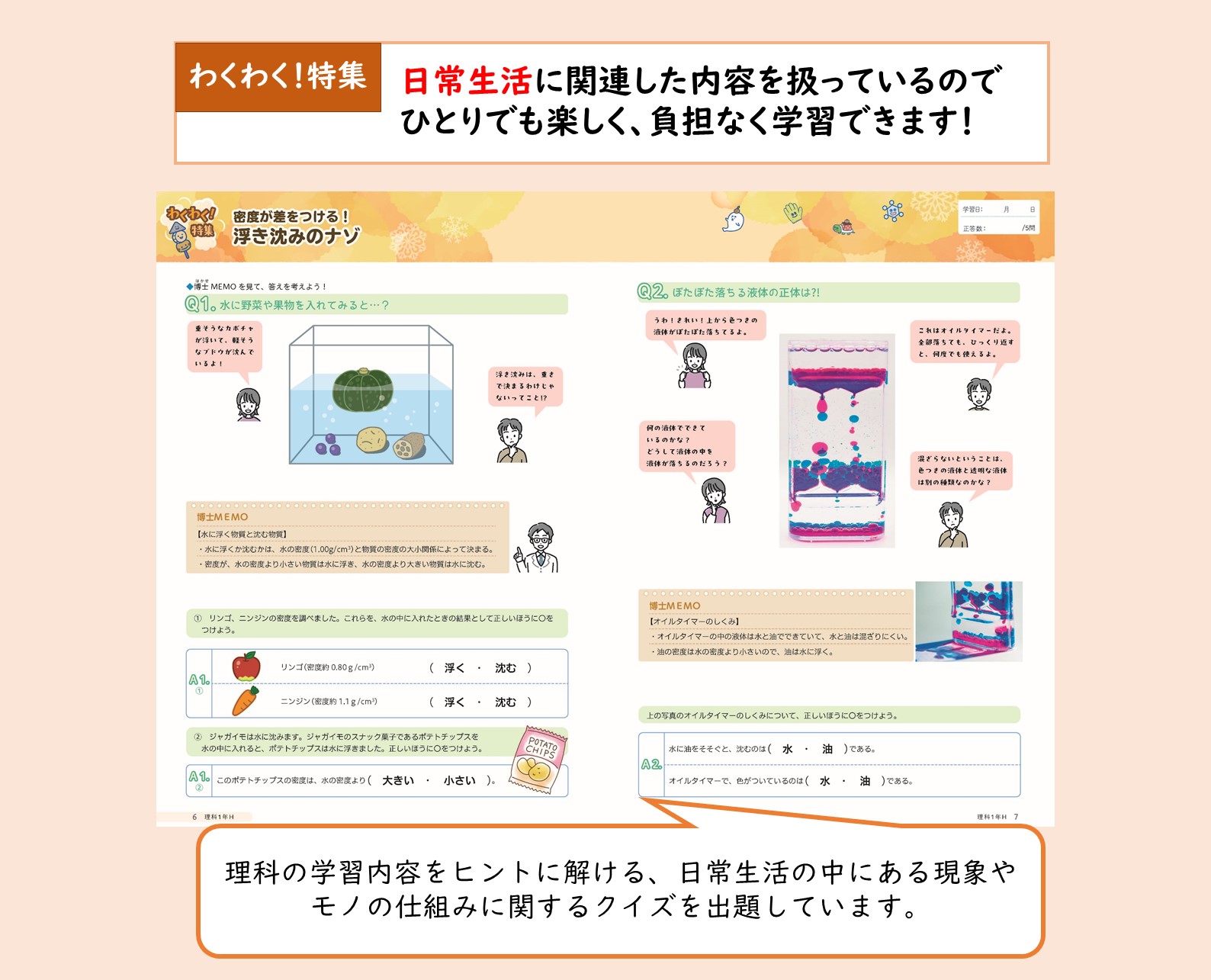 ・日常生活に絡めた「わくわく!特集」で、ひとりでも楽しく、負担なく学習できます。