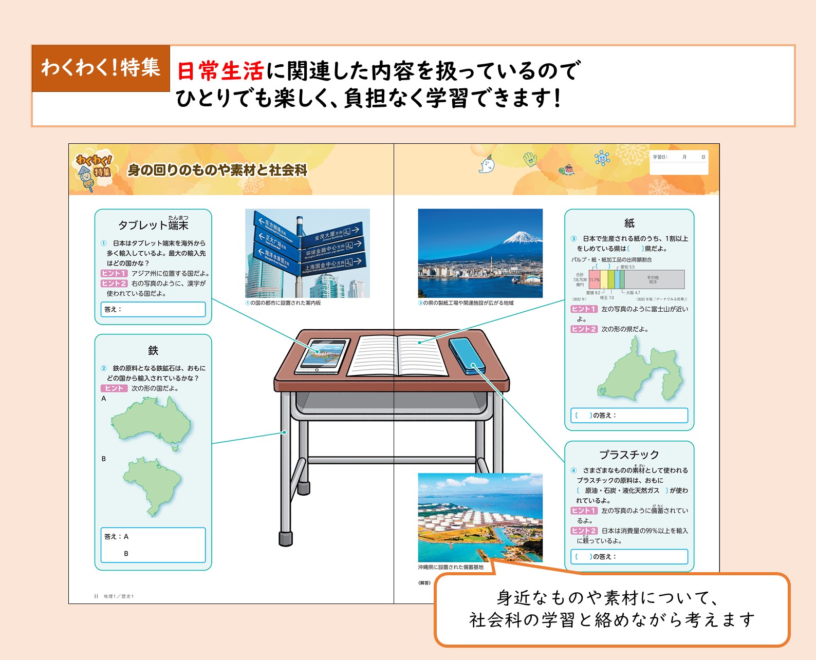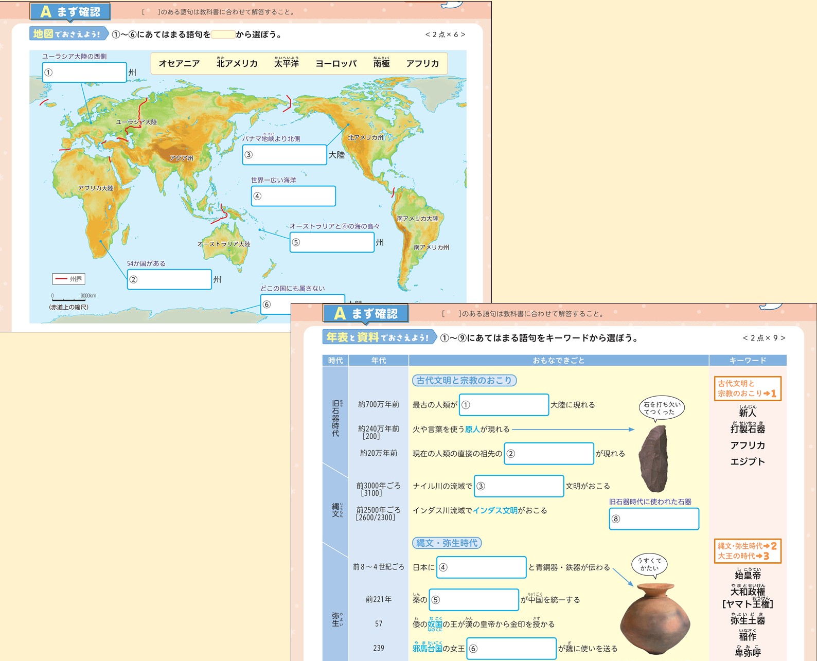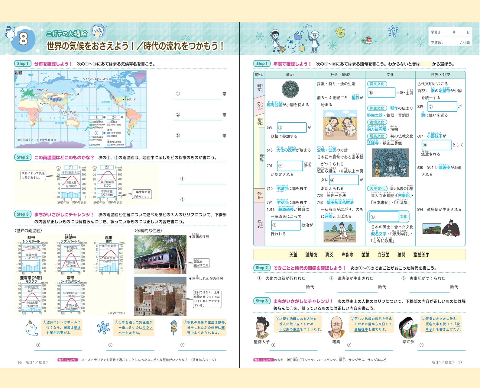 ・地理は世界の気候や日本の気候・産業、歴史は時代の流れを、資料の読み取りや間違い探しを通して楽しみながら学習できます!
